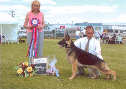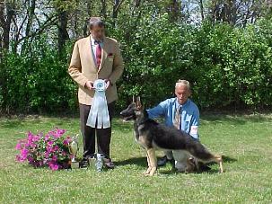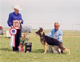 | The BIG BIG win!!! "Angel" at 16 months Best Of Breed Wild Rose GSDC June 2003 Thank you Jack for a super job of handling Angel. Thank you Edie Trockie for honoring our young girl with this win! |