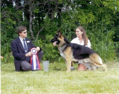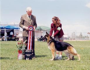 | Elvis is pictured winning the GSDC of Manitoba Specialty Show under respected GSD judge Micelle Chaloux. June 2001 This was "Elvis" first time out as a Special! |