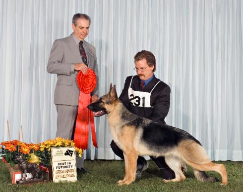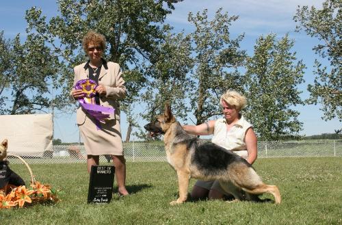 | Vision awarded Best in Maturity at the Central Region Show! Thanks to judge Joanne Randall (Ont.) Vision goes Best of Breed at the GSDC Man shows!! Thanks to judge Karen Hynek (US) Watch for her in the US in 2009!! |